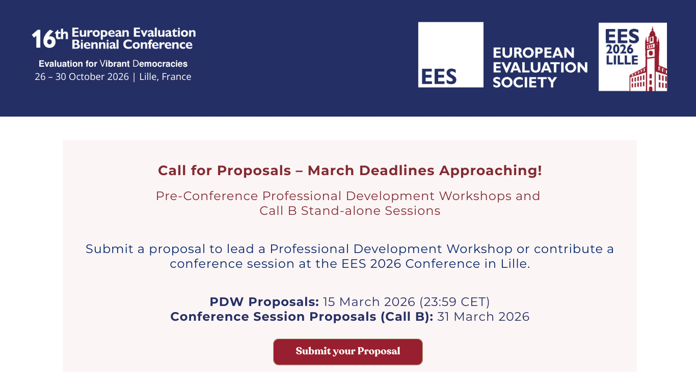 The mandate of the European Evaluation Society (EES) is to stimulate, guide and promote the theory, practice and utilization of evaluation in Europe and beyond.